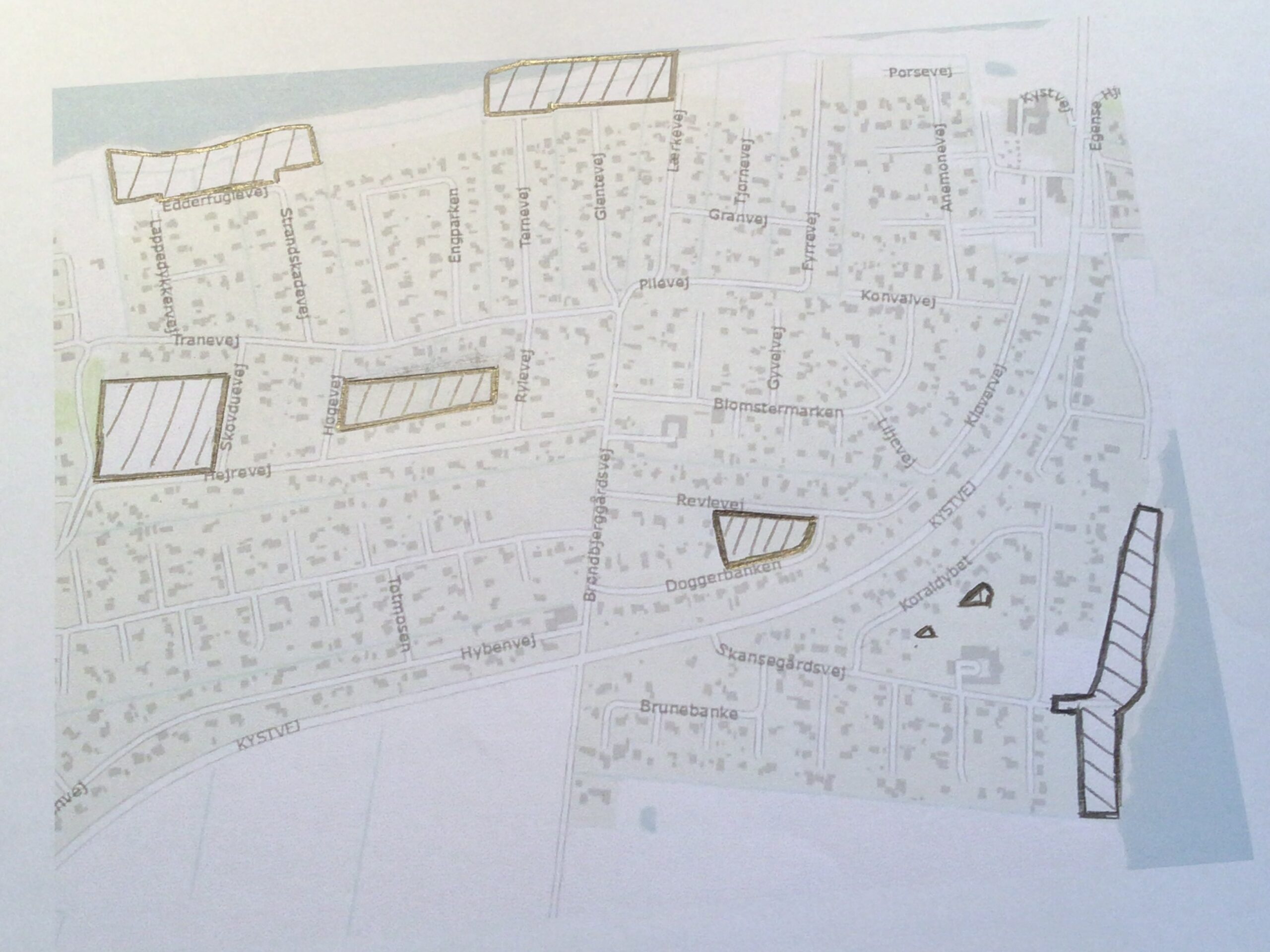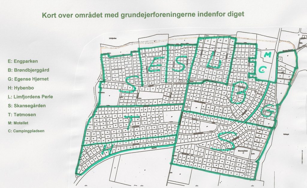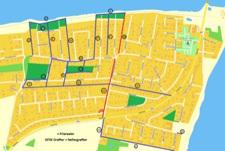 Nedenstående knapper, fællesarealer og grundejerforeningerne, linker til herværende kort, hvor fællesarealerne er markeret med skravering og foreningernes placering er angivet. Se gerne skemaet ovenfor, hvor vejnavne og matrikelnumre er angivet for GFSK. Nederst findes et link til en oversigt visende samtlige grøfter i området.